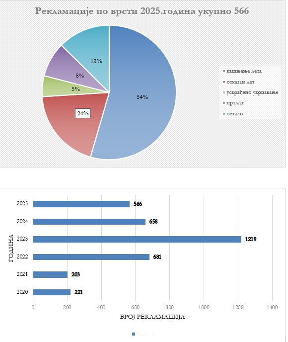 Директорат цивилног ваздухопловства Републике Србије је током 2025. године примио и обрадио 566 рекламација путника, што представља смањење у односу на претходну годину, иако је број летова и путника у међувремену значајно порастао.